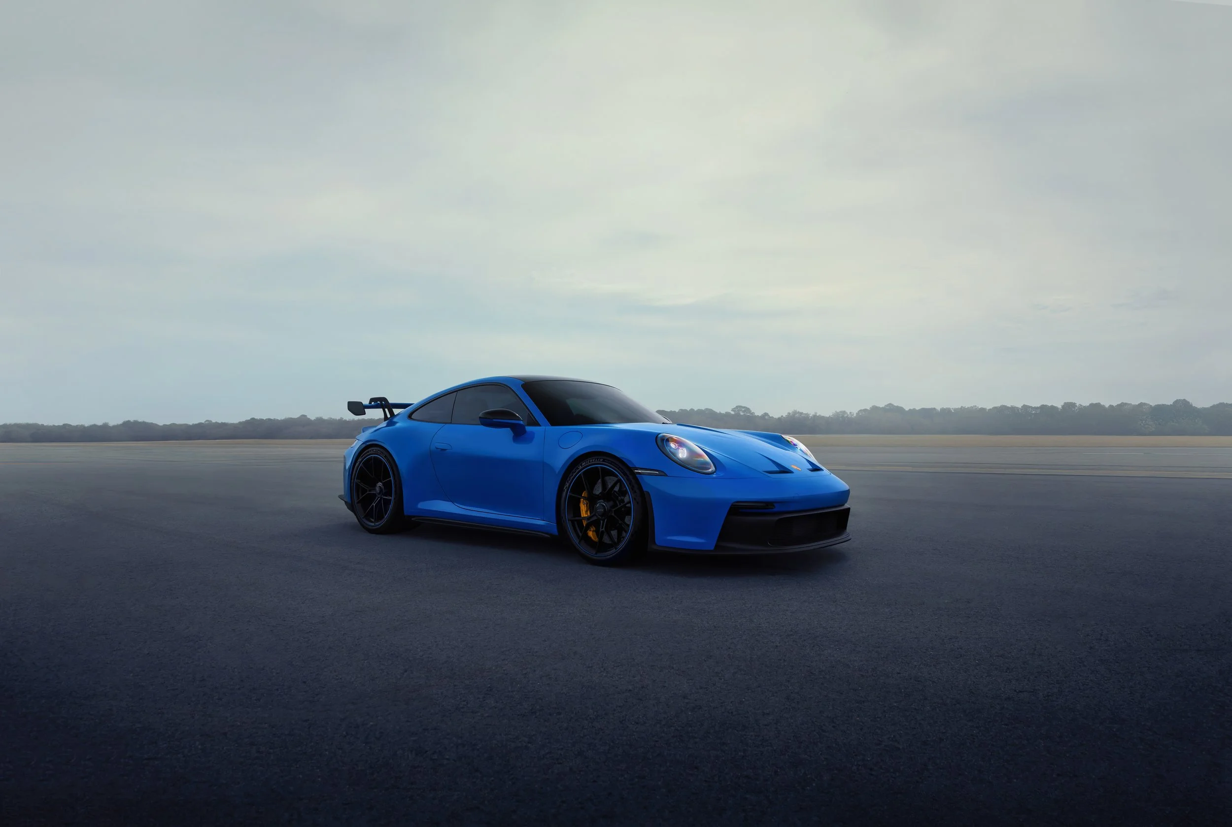 Porsche 911 GT3 captured in a dynamic and moody runway scene.